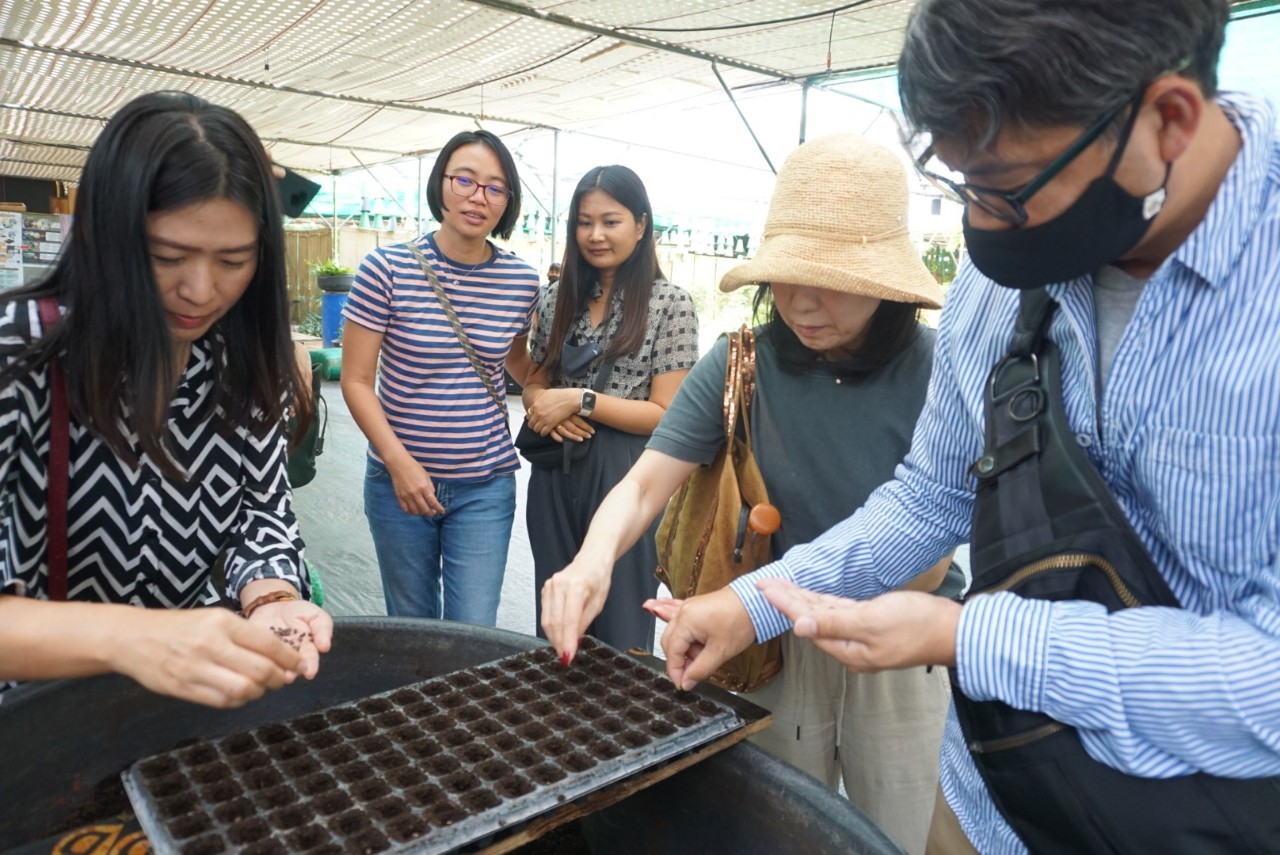 During the trip, the APTERR Secretariat visited the Pathumthani Rice Research Centre, Pathumthani province, to get learning about rice growing and breeding, seed storage, as well as the development of rice seed involving quality, variety, productivity and nutrition. The group then took a visit at Pak Pak Chong Farm in Nakhon Ratchasima province to gain a concrete understanding along with initial practice on the exercise of organic agriculture in the local community. The local organic farming has been developed by its owner to be consistent with a sustainable and sufficient pathway to secure the food stability for long-last livelihoods.