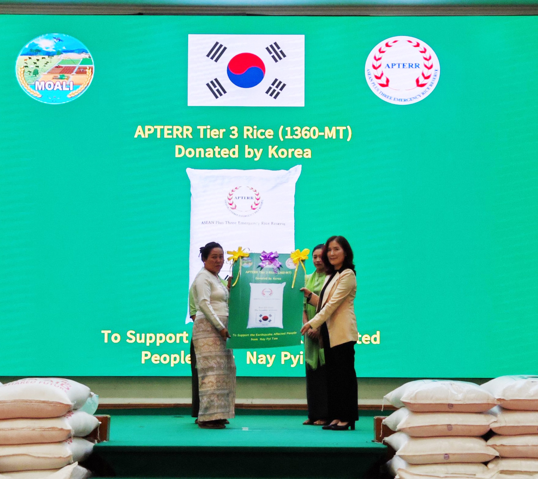 The APTERR Secretariat, led by General Manager (GM) Dr. Choomjet Karnjanakesorn, participated in the handover ceremonies of the Republic of Korea’s 3,000-MT rice contribution under APTERR Tier 3 to strengthen food security for those affected by the devastating 7.7-magnitude earthquake in Myanmar. The ceremonies were conducted in Nay Pyi Taw and Mandalay on 10-11 June 2025.