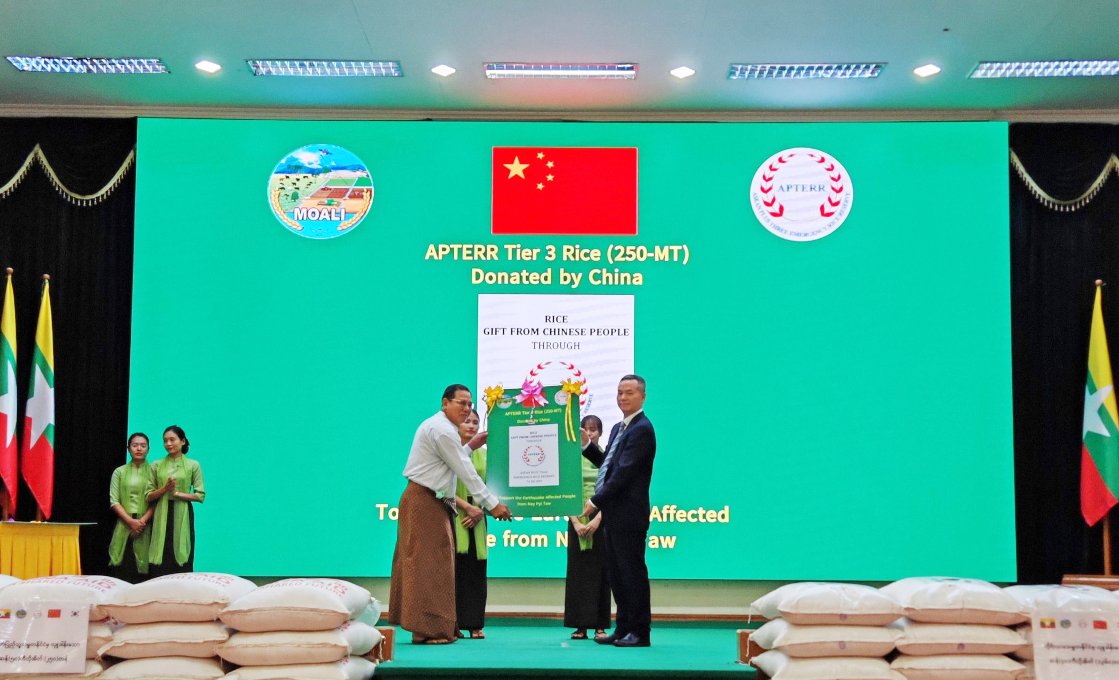 A total of 500 MT of rice contributed by the People’s Republic of China (P.R. China) under APTERR Tier 3 was officially handed over on 10-11 June 2025 to assist people affected by the devastating 7.7 magnitude earthquake in Nay Pyi Taw and Mandalay, Myanmar.
