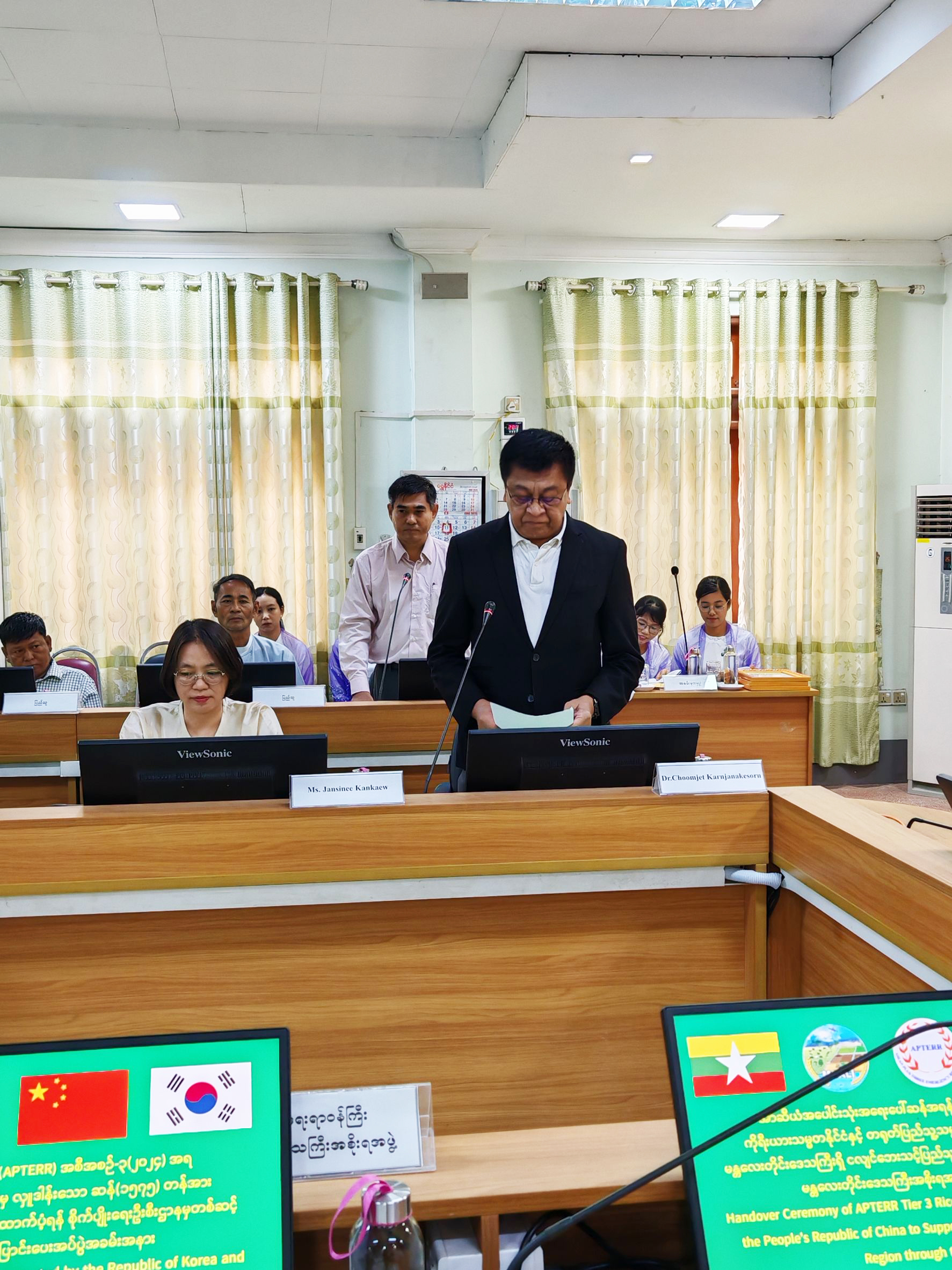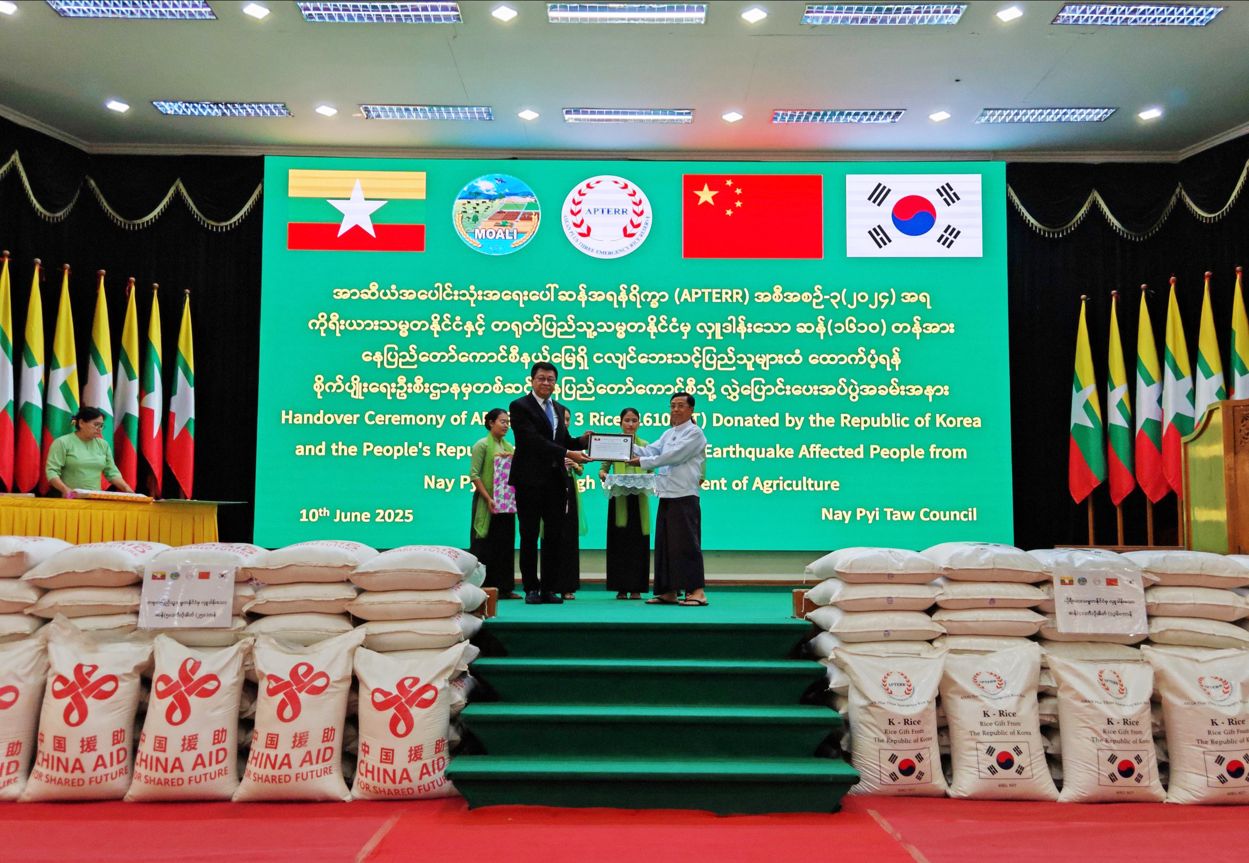 The APTERR Secretariat, led by General Manager (GM) Dr. Choomjet Karnjanakesorn, participated in the handover ceremonies of the Republic of Korea’s 3,000-MT rice contribution under APTERR Tier 3 to strengthen food security for those affected by the devastating 7.7-magnitude earthquake in Myanmar. The ceremonies were conducted in Nay Pyi Taw and Mandalay on 10-11 June 2025.