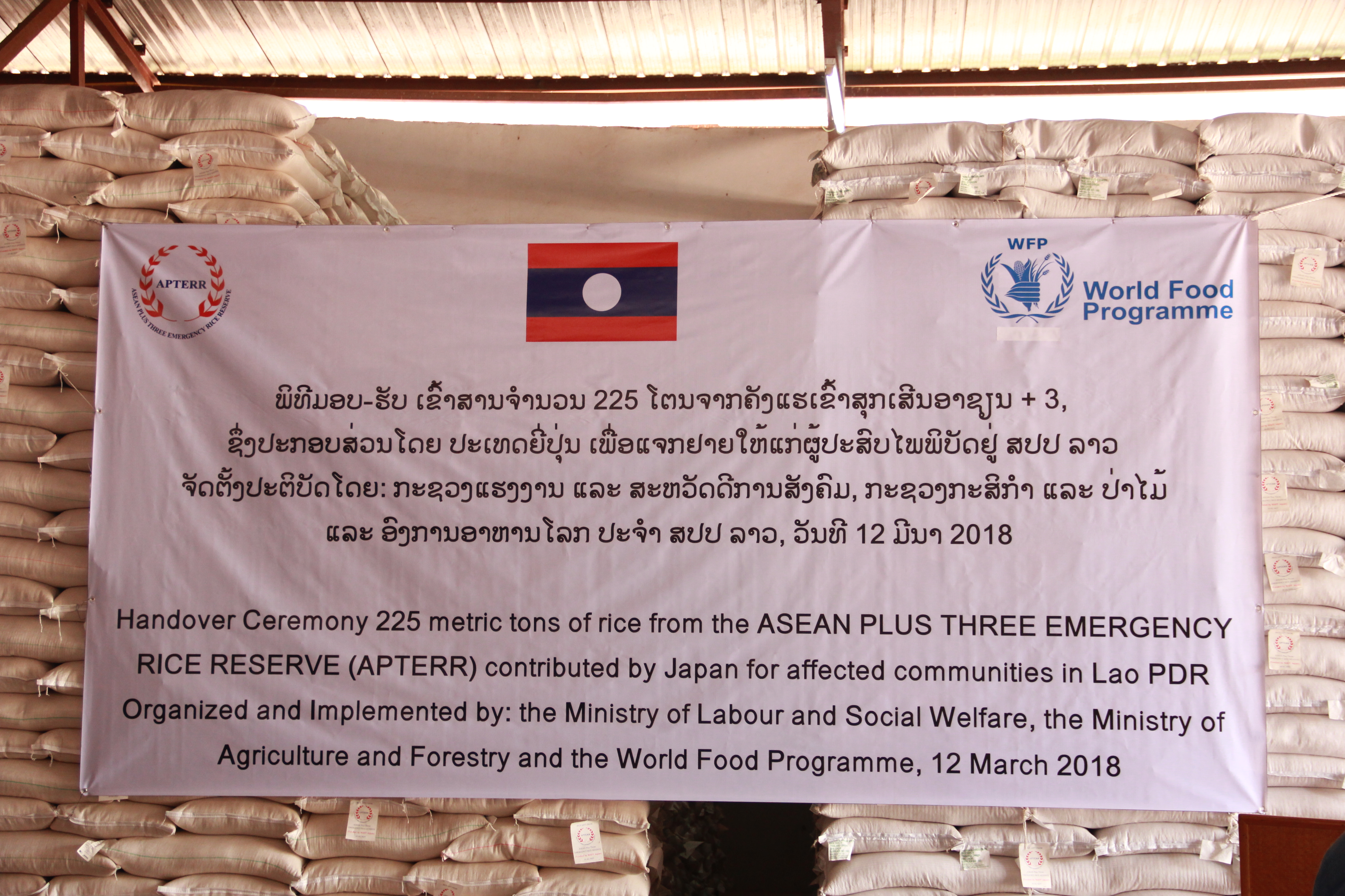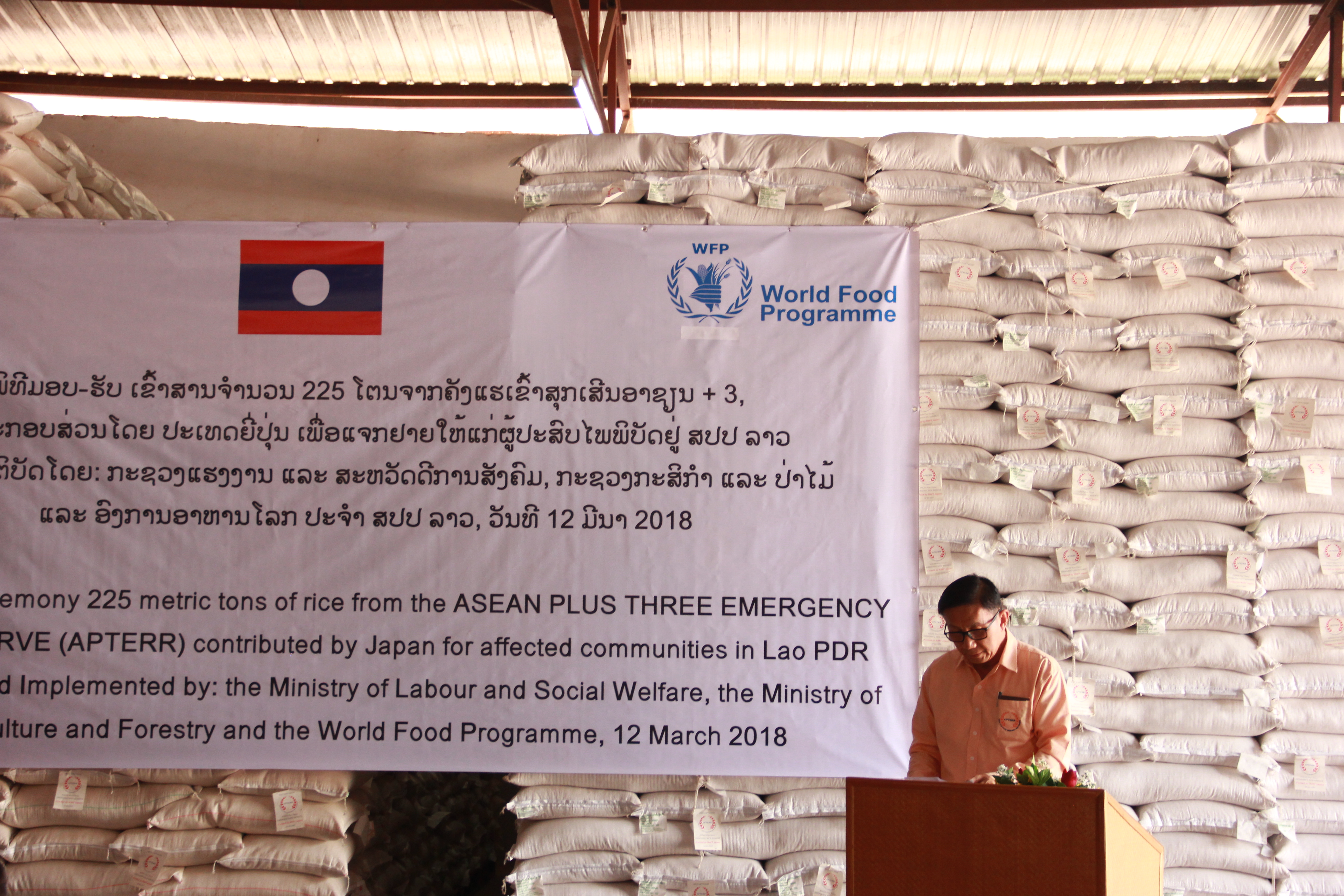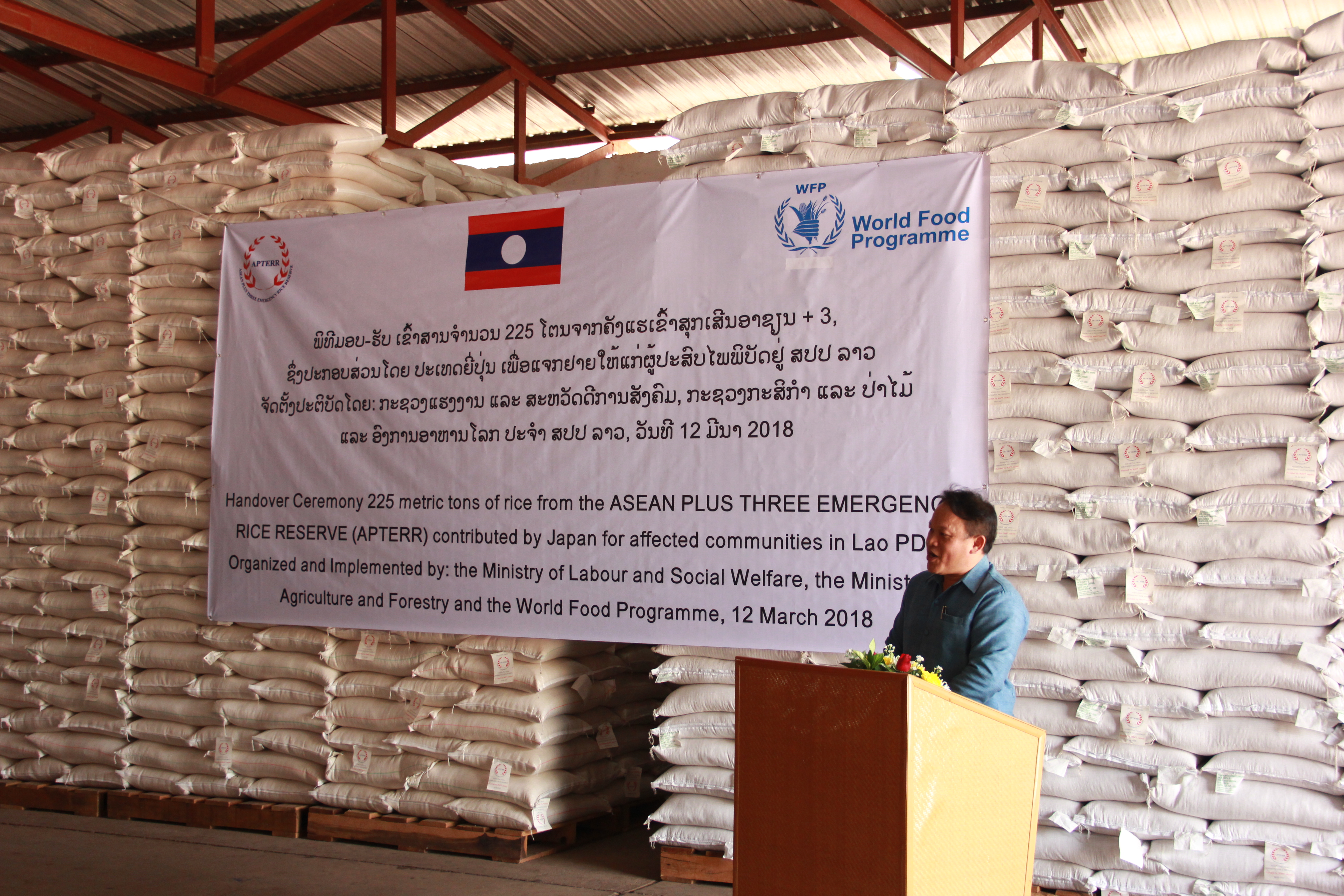 The ceremonial handover of 225-MT rice donated by the Japanese Government through the APTERR Tier 3 programme was held on 12 March 2018 in Vientiane, Lao PDR. Representatives from the Ministry of Agricultures and Forestry, Ministry of Labour and Social Welfare of Lao PDR, the Japanese Embassy, the World Food Programme, and the APTERR Secretariat attended this significant event.